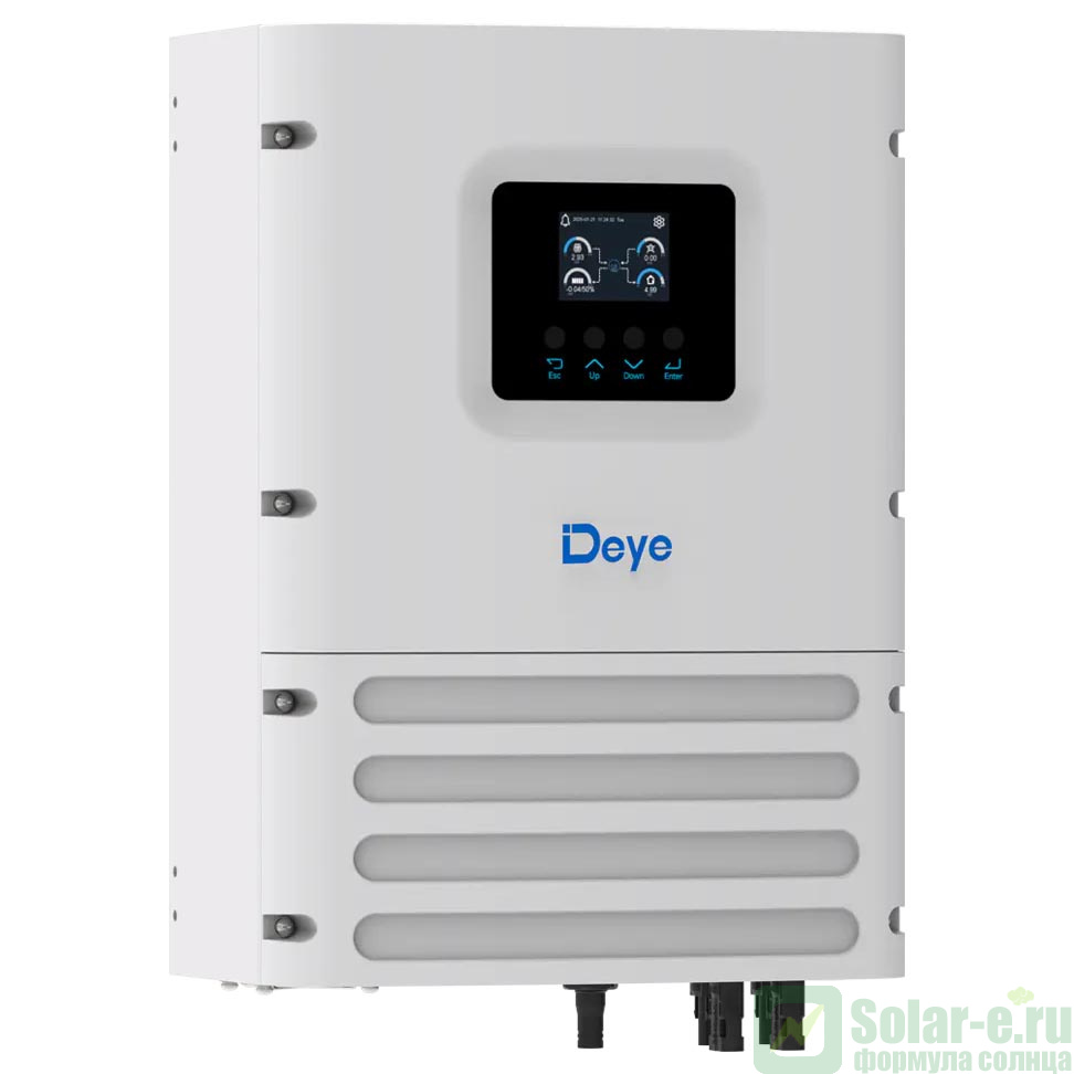 Гибридный солнечный инвертор DEYE SUN-6K-OG01LP1-EU-AM2 (PF 1.0) мощностью 6 кВт для дома и дачи это многофункциональный инвертор/зарядное устройство, в котором сочетаются функции инвертора, контроллера заряда аккумуляторов от солнечных батарей и зарядного устройства аккумуляторных батарей от сети 220В ( или генератора ) для обеспечения бесперебойной подачи питания, с возможностью выбора приоритетов зарядки и нагрузки. Используется в солнечных электростанциях и системах бесперебойного питания.