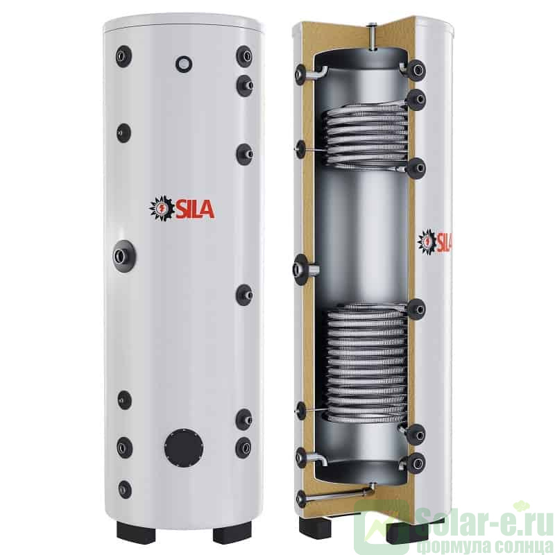 Напольный бойлер косвенного нагрева SILA SST-500-DHP ( бак аккумулятор ) объемом 500 литров из качественной нержавеющей стали толщиной 2 мм с двумя теплообменниками увеличенной площадью из медицинской нержавеющей стали SUS316L, предназначен для нагрева, аккумулирования и последующего использования горячей воды для отопления и горячего водоснабжения вашего дома. Использование в системе бака аккумулятора SILA SST-500-DHP значительно увеличивает ее ЭФФЕКТИВНОСТЬ и БЕЗОПАСНОСТЬ, предотвращая закипание и прочие неприятности. Эффективная работа твердотопливного котла или теплового насоса без бака аккумулятора – НЕВОЗМОЖНА, КПД системы снижается в разы, тепло в прямом смысле этого слова вылетает в трубу.