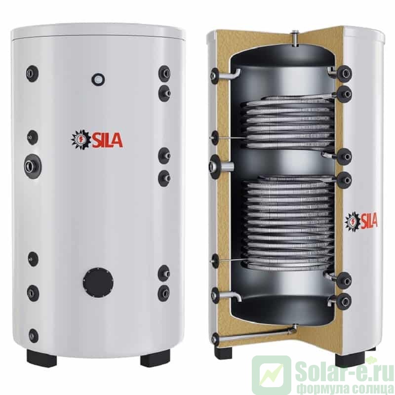 Напольный бойлер косвенного нагрева SILA SST-800-D ( бак аккумулятор ) объемом 800 литров из качественной нержавеющей стали толщиной 2,5 мм, с двумя теплообменниками из медицинской нержавеющей стали SUS316L, предназначен для нагрева, аккумулирования и последующего использования горячей воды для отопления и горячего водоснабжения вашего дома. Использование в системе бака аккумулятора SILA SST-800-D значительно увеличивает ее ЭФФЕКТИВНОСТЬ и БЕЗОПАСНОСТЬ, предотвращая закипание и прочие неприятности. Эффективная работа твердотопливного котла или теплового насоса без бака аккумулятора – НЕВОЗМОЖНА, КПД системы снижается в разы, тепло в прямом смысле этого слова вылетает в трубу.